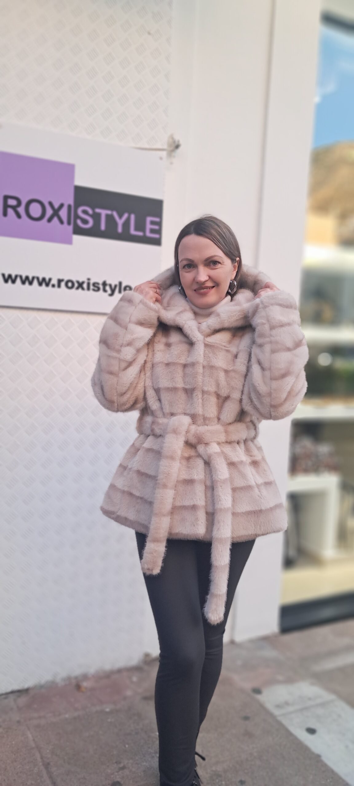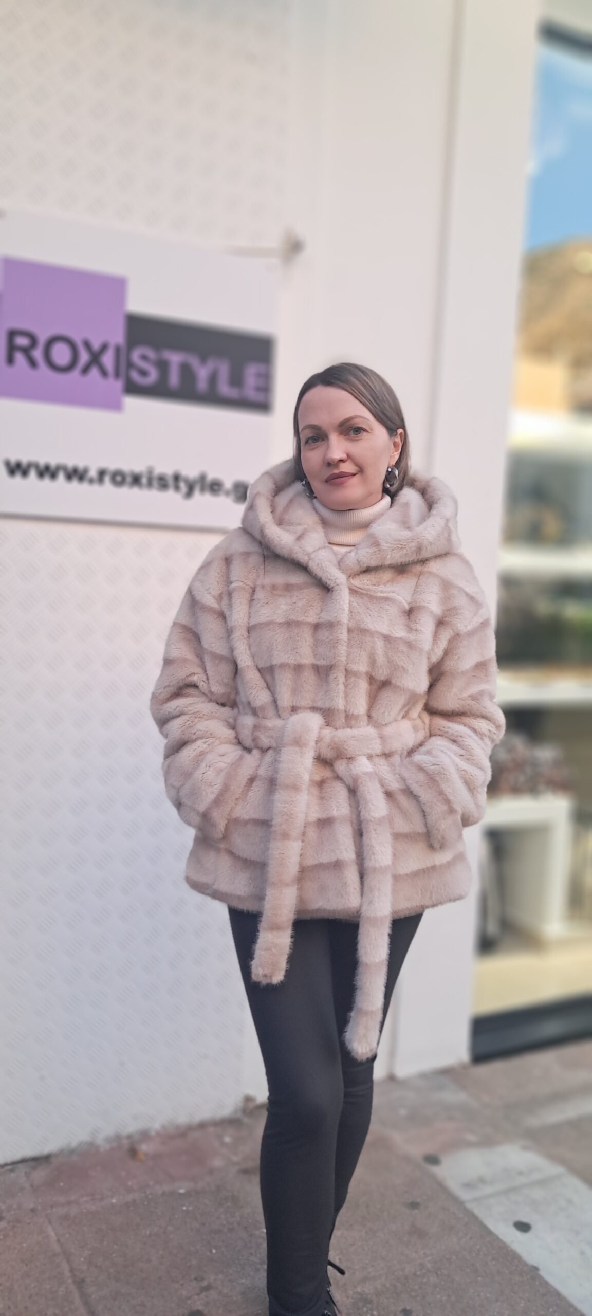 Γυναικεία γούνα με κουκούλα και ζώνη