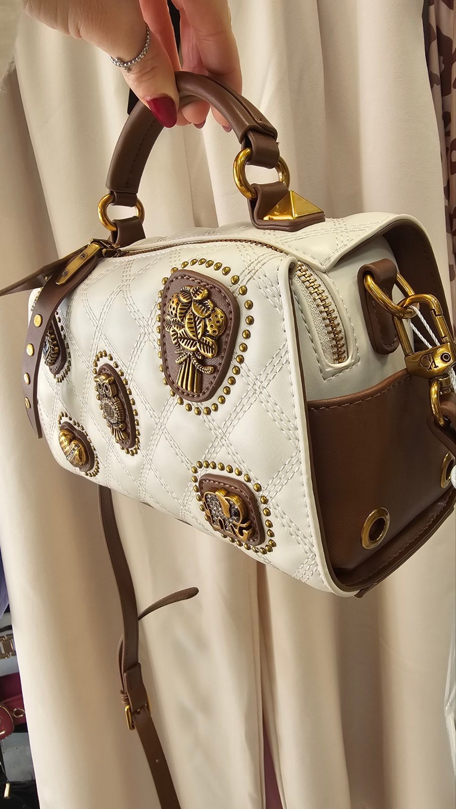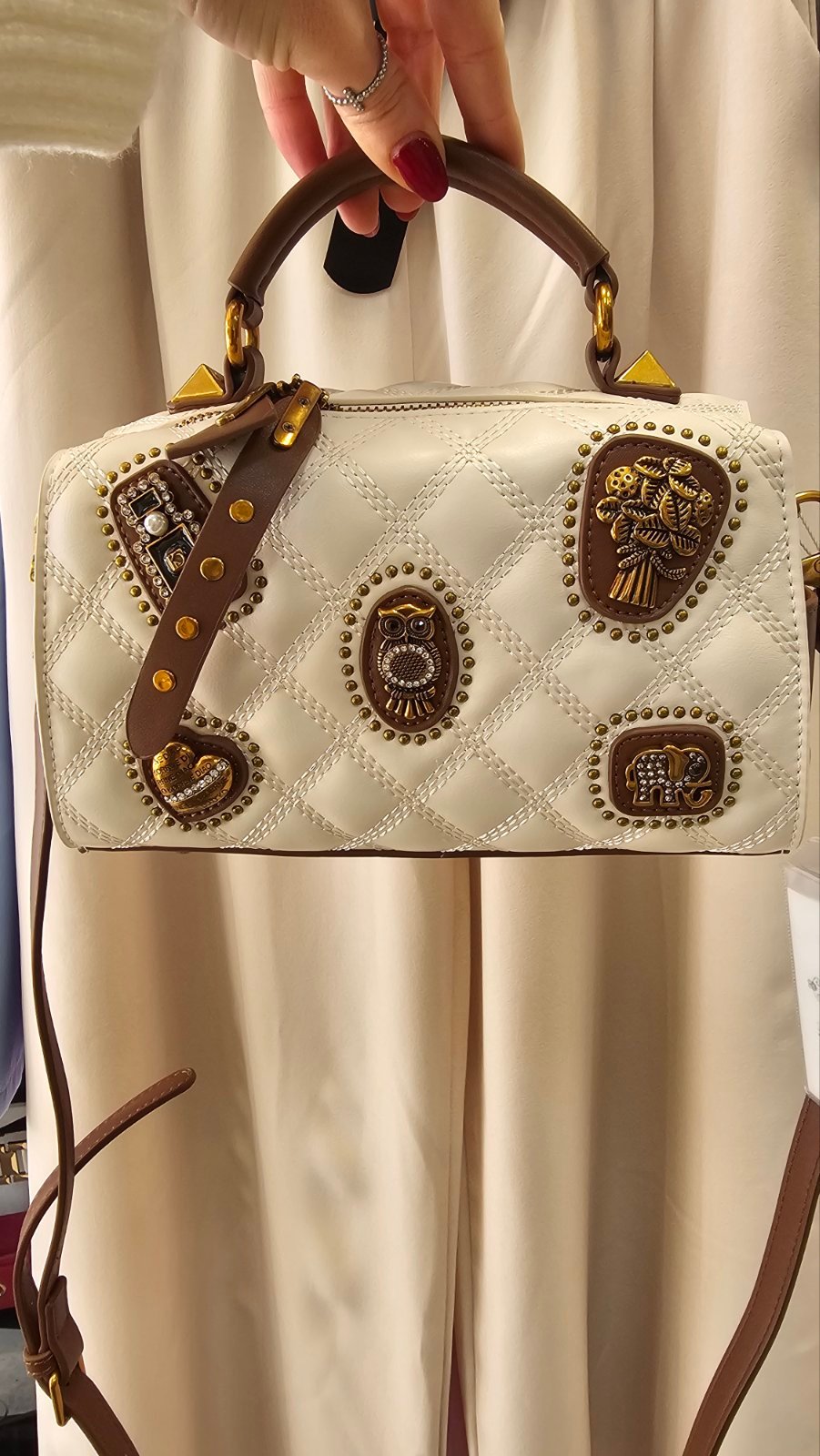 Αυτή η τσάντα είναι ένα μοντέλο της μάρκας Rossella. Είναι κατασκευασμένη σε κομψό λευκό χρώμα με φιγούρα και είναι διακοσμημένη με διάφορα διακοσμητικά μεταλλικά στοιχεία, μεταξύ των οποίων μπορείτε να δείτε μια κουκουβάγια, ένα μπουκέτο λουλούδια, έναν ελέφαντα και μια καρδιά.