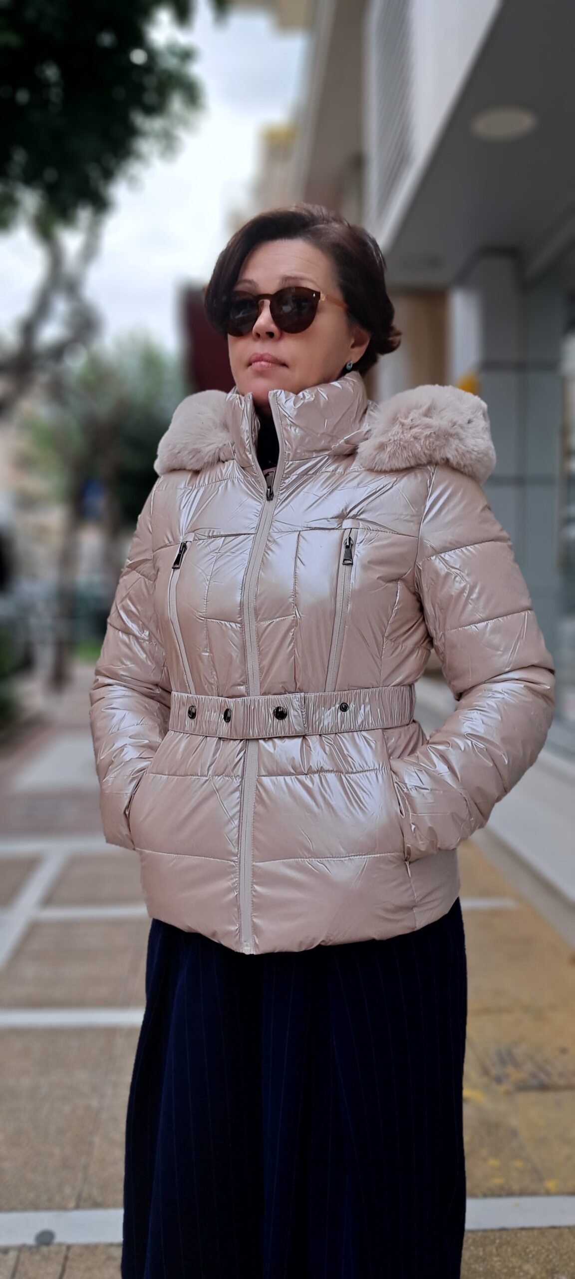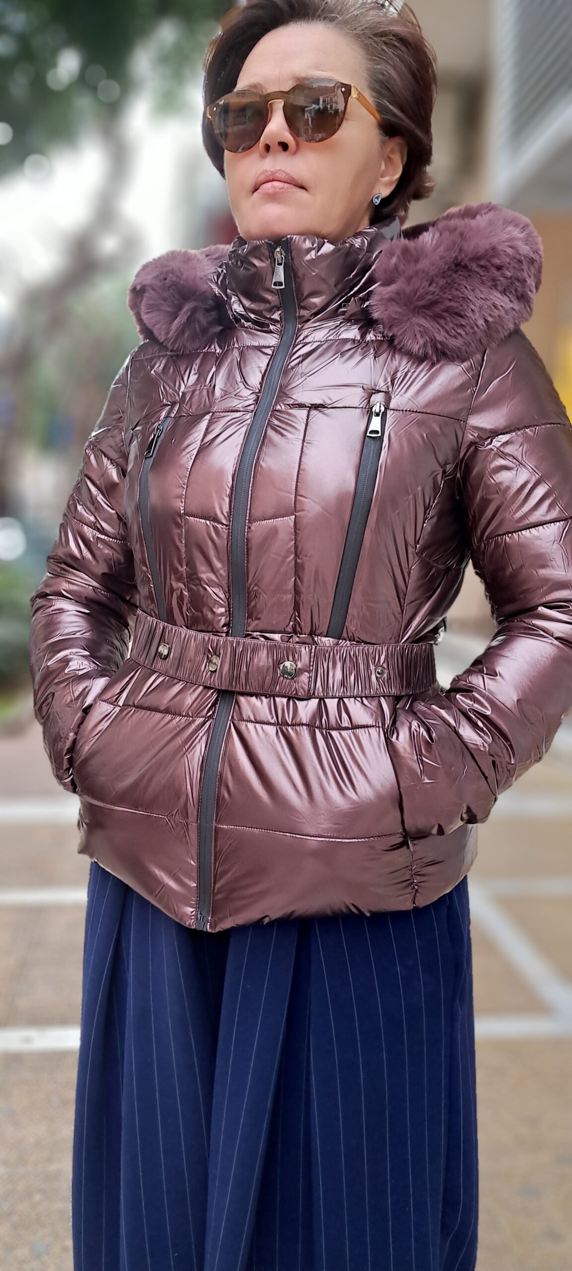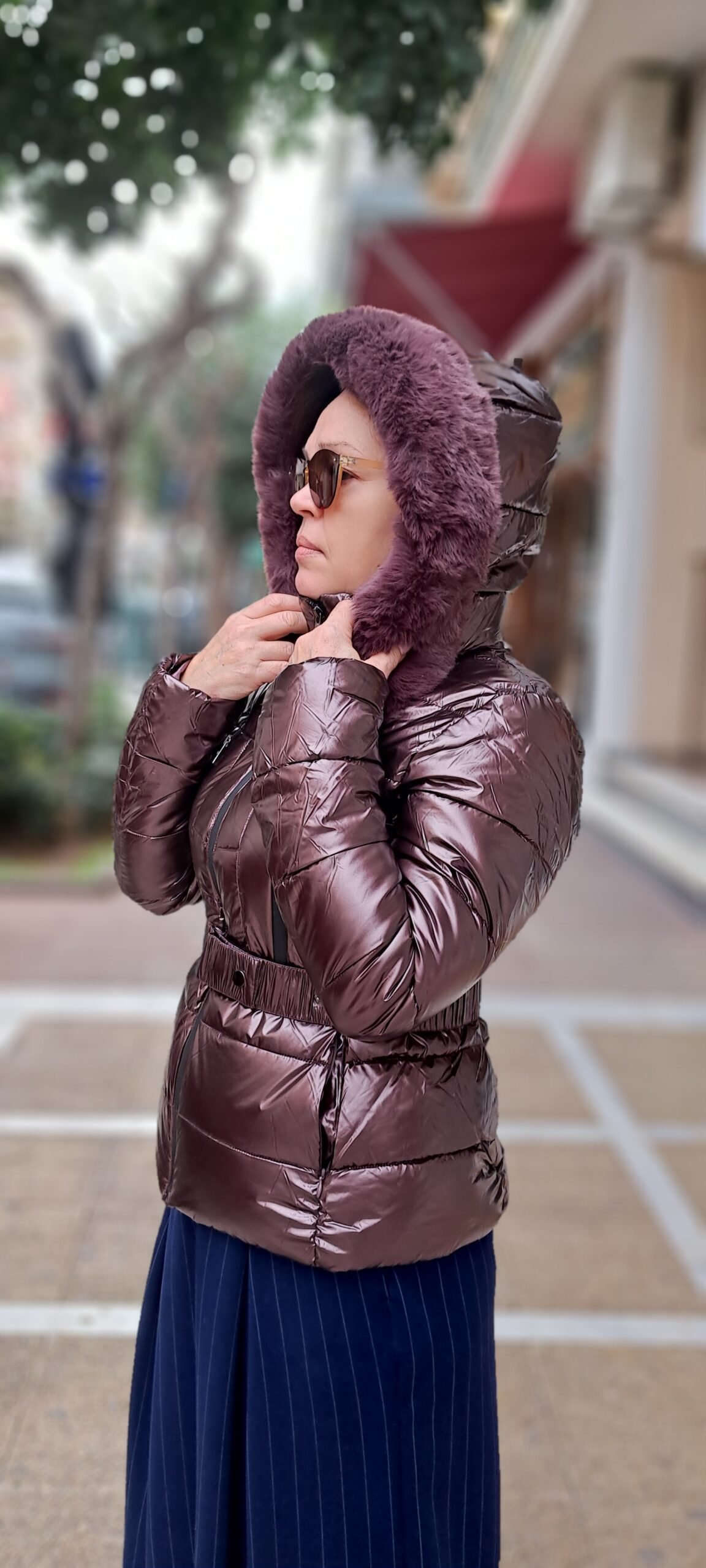 Γυναικείο μπουφάν γυαλιστερό με κουκούλα και ζώνη. Κουμπώνει με φερμουάρ. Είναι πολύ ελαφρύ και ώμος πολύ ζεστό. Διαθέσιμο σε δύο χρώματα: μπεζ, μελιτζάνα