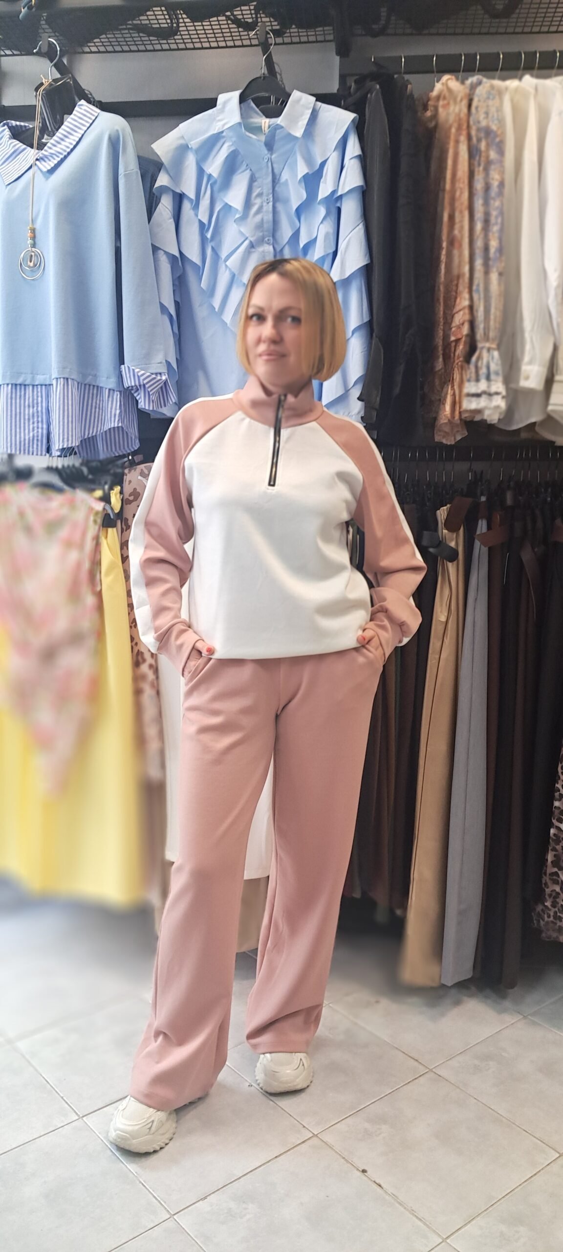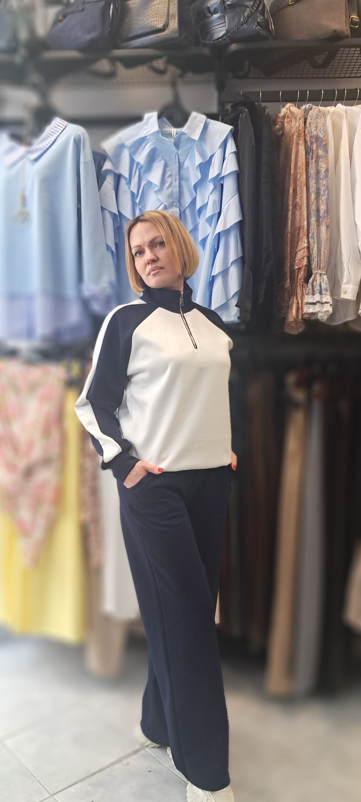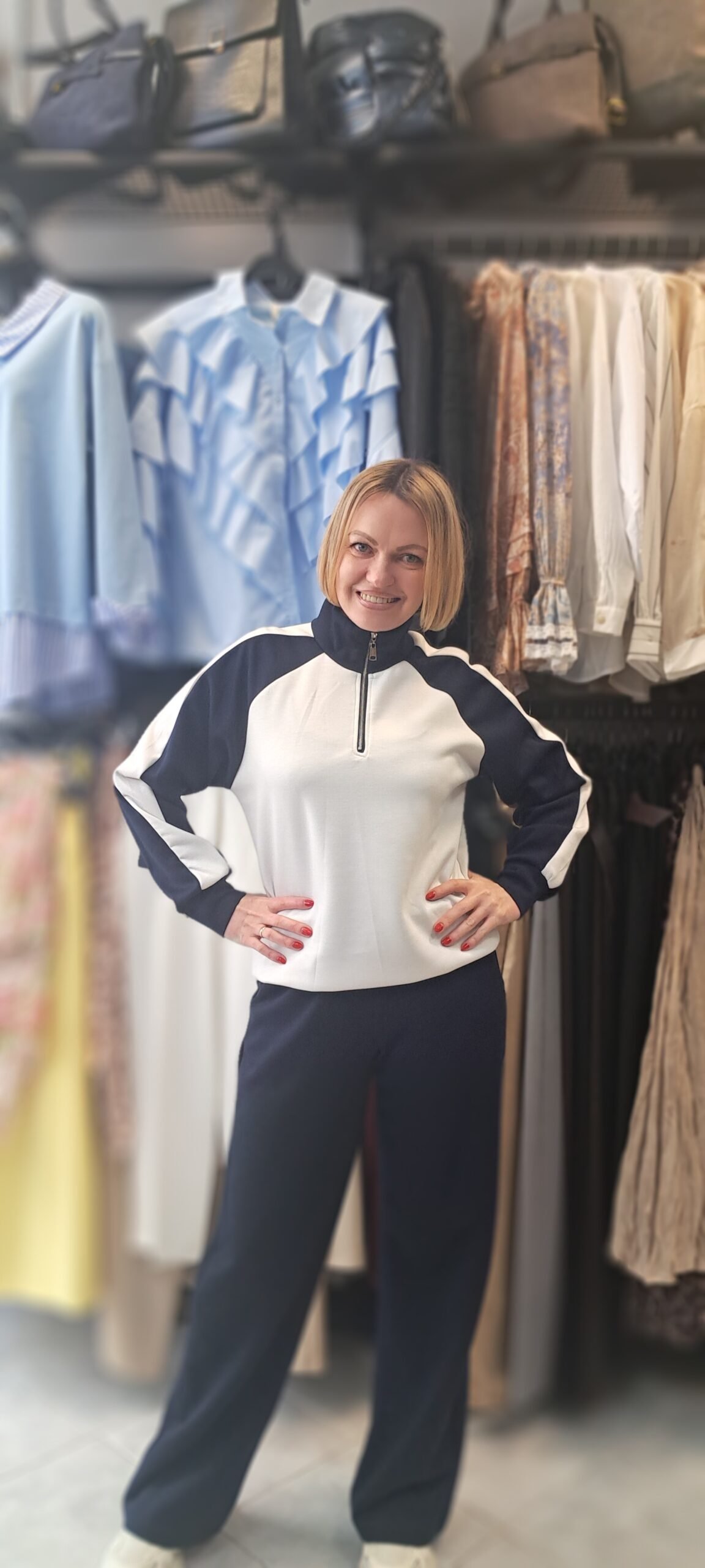 Γυναικείο σετ φόρμας σε κλασικό συνδυασμό. Φούτερ διαθέτει ψηλό γιακά με φερμουάρ. Παντελόνι μονόχρωμο με ίσια γραμμή.